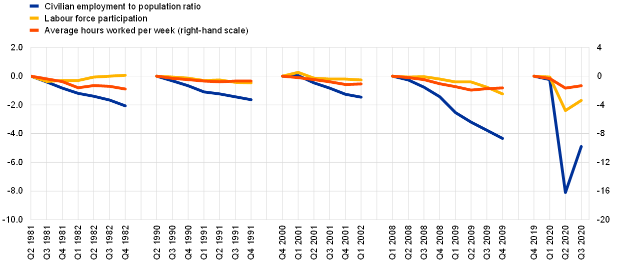 The decline in employment has been unprecedented compared to previous recessions. One relevant aspect for understanding the increase in unemployment is its link to the decline in employment related to developments in labour force participation. Chart B shows that in past recessions the bulk of the increase in unemployment was related to the decline in employment. By contrast, in the COVID-19 crisis, not only has the decline in employment been high compared to previous recessions, but the decline in participation has also limited the increase in unemployment to a greater extent than in the past. Hours worked per worker also showed a slightly more marked adjustment than in previous recessions (see Chart B).