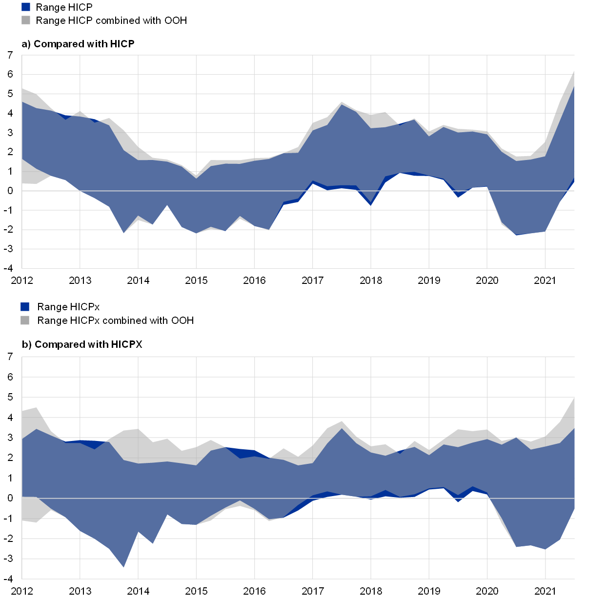 Note: Panels a and b show the range of HICP and HICPX inflation rates across euro area countries when OOH is added (grey) and when OOH is not added (dark blue). Where the ranges overlap, the shading is light blue.