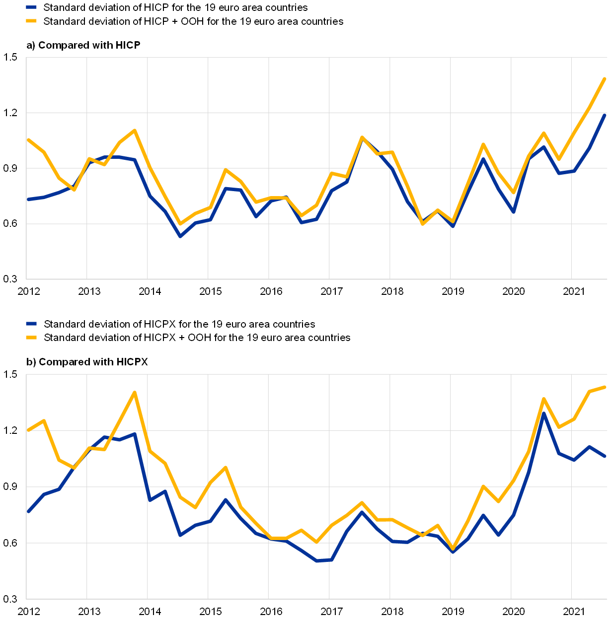 Overall, according to the ECB’s preliminary estimates, inflation dispersion across countries seems not to be significantly affected by the inclusion of OOHPIs. Chart 6 shows minimum and maximum inflation across euro area countries for each quarter since 2012, both for HICPs and for the new indices that include OOHPIs. Differences between the ranges of the two measures seem to be very small, both for headline and for HICPX inflation. Chart 7 plots the standard deviations of inflation across countries for both the HICP and the HICPX. In line with Chart 6, the impact of the inclusion of OOH on overall inflation dispersion seems to be limited.