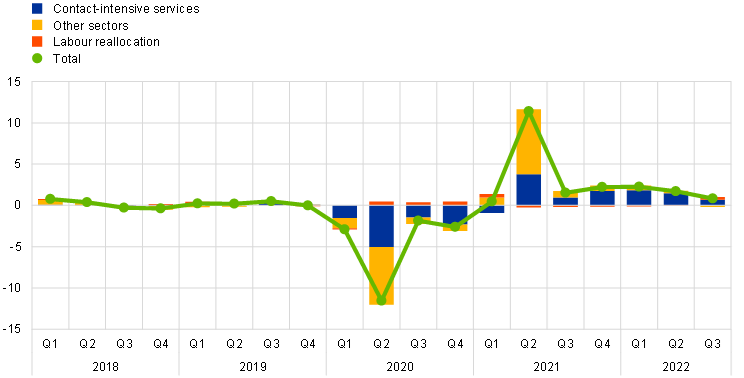 Note: The aggregate labour productivity growth is decomposed into growth originating from within economic sectors (within-sector component) and from change in the employment shares of the sectors (between-sector labour reallocation component). Furthermore, the within-sector component can be decomposed into the contribution of sectors less and more exposed to the COVID-19 shock. The latter are the contact-intensive services and include the following sectors under the NACE classification: wholesale and retail trade, repair of motor vehicles and motorcycles (code G in the NACE classification), transportation and storage (H), accommodation and food service activities (I), arts, entertainment and recreation (R) and other activities (S-U).