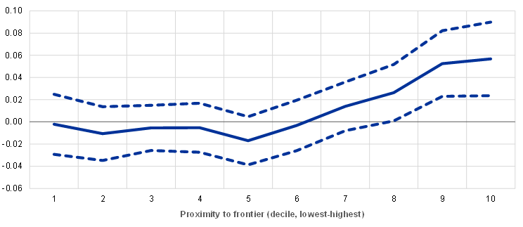 Monetary policy also played a role in mitigating the adverse effects of the crisis brought on by the COVID-19 pandemic. At the time of writing, it was not yet possible to quantify the impact of monetary policy on firm-level productivity growth as firm-level data were not yet available for the period following 2020/2021. However, an analysis of historical data can give some indication of the possible effects of monetary policy during the pandemic. In general, monetary policy has an impact on productivity by positively affecting the business cycle, but also by reducing financial frictions of relatively high productivity firms.[10]