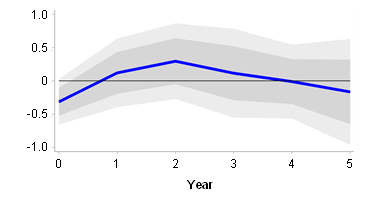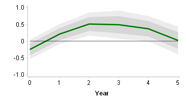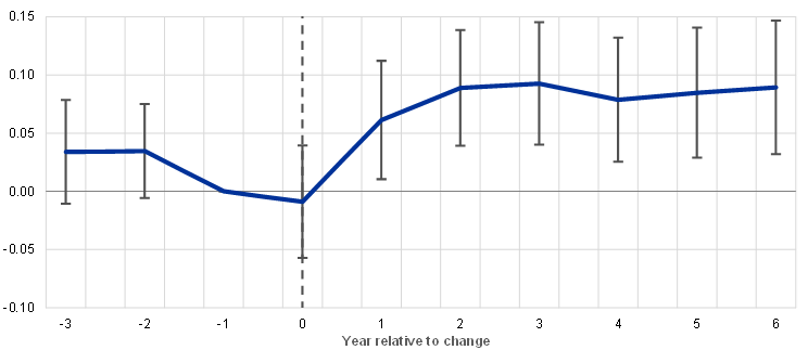 Note: The chart refers to the results based on French firm-level data, although results for Austria are qualitatively similar. The chart shows the average difference in productivity growth up to six years after the investment between two groups of firms: firms that invested a lot in digitalisation and firms that invested less in digitalisation. The whiskers represent a 95% confidence interval.