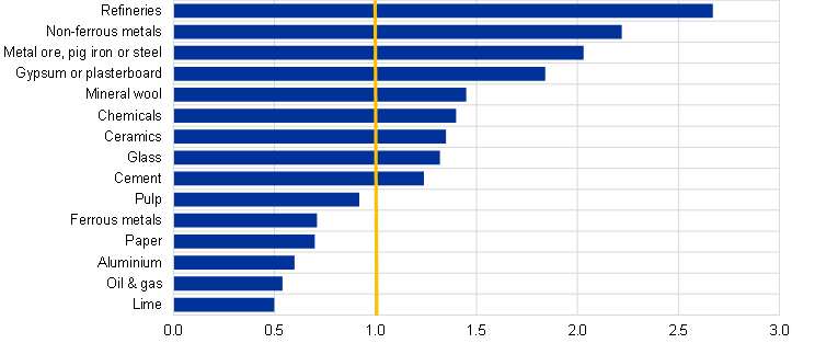 The effects of within-sector reallocation of resources are less clear and vary across sectors. Firm-level carbon intensity and labour productivity are not necessarily correlated. Therefore, reallocating output from high to low carbon-intensive firms does not necessarily lead to increased productivity. Firm-level information from the EU Emissions Trading System (ETS) for the period 2005-2020 shows that in the majority of sectors, the most carbon-efficient firms are also the most productive ones. At current firm-level productivity levels, reallocation of output towards greener firms will result in increases in labour productivity growth in those sectors, all other things being equal. However, for other sectors such as pulp, paper and ferrous metals, the contrary is the case, and the reallocation will be productivity-decreasing (Chart 10, panel a).[36]