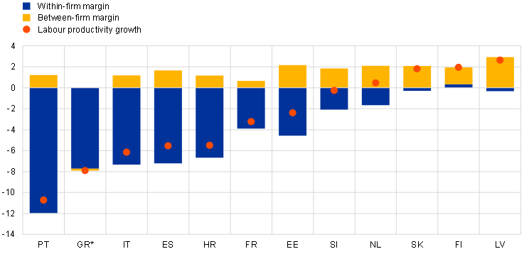 The decline in productivity per employee in 2020 was driven by the strong decline in within-firm productivity growth. Chart 2 decomposes sectoral labour productivity growth in selected euro area countries between 2019 and 2020 into the contributions of the within-firm component and the reallocation of labour across firms in the sector (between-firm component).[4] In most countries there was a strong decline in within-firm productivity growth. This reflects the effect of the reduced capital utilisation, the JRS and the consequent larger drop in output relative to the number of employees.