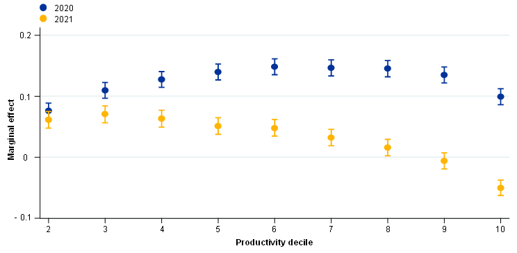 Probability of receiving wage subsidies by productivity of the firm, 2020 and 2021