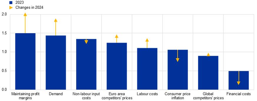 According to the responses, on average, firms considered maintaining profit margins; demand for their product or service; input costs, especially non-labour costs; euro area and global competitors’ prices and consumer price inflation to be important for their price-setting decisions in 2023 (Chart A). Financial costs were considered less important. To the extent that the response options overlapped, the answers on what was important for price setting differed very little from those in the 2019 survey.[24] For 2024, on average, respondents indicated that maintaining profit margins and demand for their product or service would be increasingly important, as would, albeit to a lesser extent, competitors’ prices and labour costs. Consumer price inflation and financial costs would become less important.