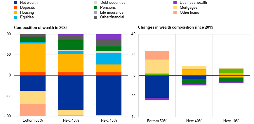 The concentration of wealth varies both across instruments and over time, reflecting differences in preferences, in access to various asset classes and in credit and liquidity constraints. Concentration is particularly high for financial assets exposed to changes in value: around 80% of equities, investment fund shares and bond holdings are held by the top 10% wealthiest households (Chart 2). Business wealth exhibits similarly high concentration. Deposit holdings, housing wealth and liabilities (mortgages and other types of loan) are more evenly spread. Since 2015 there has been an increase in the concentration of housing wealth and mortgage debt, meaning a faster pace of accumulation – including through valuation effects – among wealthier households than poorer households. Moreover, relative holdings of debt securities and equity increased for the next 40% of households with wealth above the median.