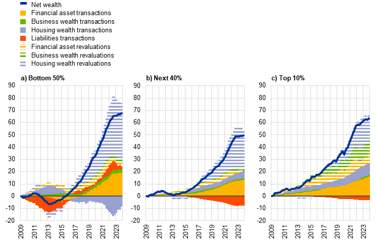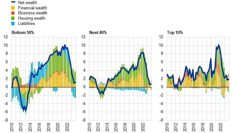Notes: Valuation effects by instrument are computed from the aggregate Quarterly Sectoral Accounts (QSA) by subtracting quarterly transactions from differences in outstanding amounts (OA) which include flows, changes in valuations and other changes. Housing revaluations are computed by subtracting housing investment flows (approximated by household gross fixed capital formation plus acquisition of non-financial assets net of consumption of fixed capital) from changes in the housing capital stock (approximated by household non-financial fixed assets including land). Business wealth revaluations are computed from a weighted average of the investment deflators for machinery and equipment and for commercial property prices. The QSA valuation changes by instrument are then applied proportionately (in terms of quarterly percentage changes) to the corresponding instrument holdings across each decile in the wealth distribution to decompose OA stocks into valuation effects (including other changes) and notional stocks (derived from the cumulation of transactions). Liabilities are assumed to result only from transactions. The latest observations are for the fourth quarter of 2023.
