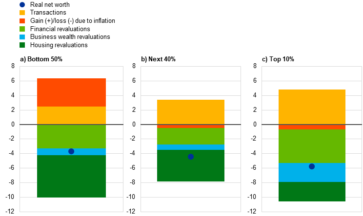 Notes: The decomposition is based on Infante, L. et al., op. cit. Net worth is deflated with the private consumption deflator. Instruments highly exposed to inflation (whose reimbursement value is set in advance in nominal terms) include deposits and liabilities (mortgages and other debt). The net effect from the impact of higher inflation on deposits (negative) and on liabilities (positive) is aggregated under “Gain(+)/loss(-) due to inflation”. For all other assets, revaluations are based on the contributions from cumulative real asset price changes applied at individual instrument class level, derived on the basis of nominal revaluations by instrument taken from the aggregate QSA deflated with the private consumption deflator, and applied to outstanding instrument positions by wealth decile as of the second quarter of 2021. The real asset price revaluation effects are grouped under “Financial revaluations” for all financial assets other than deposits (i.e. listed shares, investment funds, bonds and insurance claims). “Business wealth revaluations” is the sum of financial and non-financial business wealth. Transactions are computed as a residual and group acquisitions of any instruments over the period.