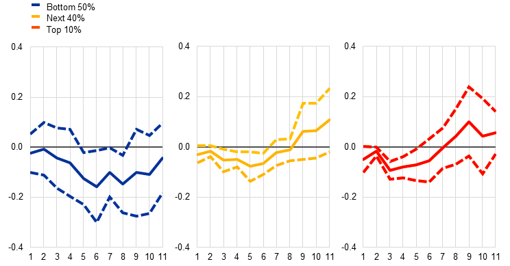 Empirical evidence points to dampening effects of monetary policy tightening across the wealth distribution. Changes in asset prices have a direct impact on household balance sheets.[30] Following the start of monetary policy tightening, equity prices initially declined in the first three quarters of 2022 but subsequently rebounded strongly. In contrast, house prices, which usually exhibit lower volatility, only began declining more visibly later in response to higher interest rates, although the total decline remained modest for the euro area as a whole amidst heterogeneous developments across countries. A linear panel local projections framework is used to assess the impact of monetary policy tightening on the wealth distribution, with a focus on the housing and financial wealth channels.[31] Empirical estimates point to a dampening effect of monetary policy tightening which is heterogenous across the wealth distribution.[32] Overall, all household groups lose in terms of their net wealth (Chart 8, panel a). While the bottom 50% lose mainly via housing wealth due to lower house prices, the next 40%, and especially the top 10%, lose primarily via financial wealth channels, with the housing channel playing a more limited role. Nevertheless, for the latter group, net wealth tends to recover quicker in line with equity prices rebounding faster than house prices (Chart 8, panel b), despite a relatively larger initial fall following the monetary policy shock. Overall, the monetary policy tightening seems to have a dampening effect across the wealth distribution, with the housing channel playing a relatively stronger role for the less wealthy, while the financial channels seem more important for the wealthiest households.[33]