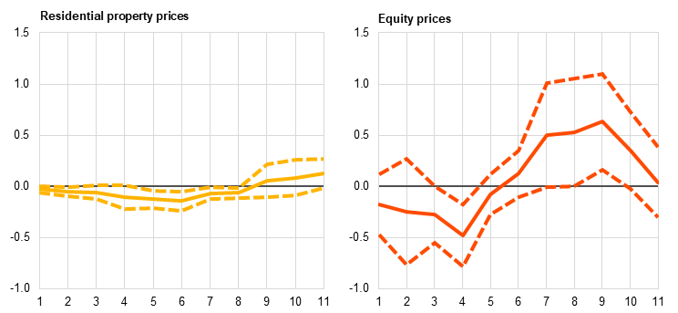 Notes: Panel a) shows the results based on a panel local projections model for the five largest euro area countries (Germany, France Italy, Spain and the Netherlands) with an (unbalanced) sample, running from the fourth quarter of 2009 to the fourth quarter of 2023 and accounting for country-fixed effects. The model includes as dependent variables the net wealth for the three relevant groups of the wealth distribution − bottom 50%, next 40% and top 10% − and the monetary policy shocks corresponding to monetary policy surprises, as reflected in changes in one-year overnight index swap risk-free rates around the ECB’s monetary policy announcements, as identified in Altavilla, C. et al. (2019) as an exogenous variable.[34] Following Lenza, M. and Slacalek, J., op. cit., asset (real estate and equity) prices have been added to the model alongside real GDP, short-term rate and inflation. Panel b) shows the results based on a panel local projections model, including as dependent variables asset prices. The model includes four lags of the dependent variables as well as lags of the control variables. The dashed lines reflect the 95% confidence intervals. The results for wealth-specific instruments for the three groups of the wealth distribution are consistent with the findings in Chart 8, panel a), showing that housing wealth declines in relative terms slightly more for the bottom 50%, while financial wealth more for the top 10%.
