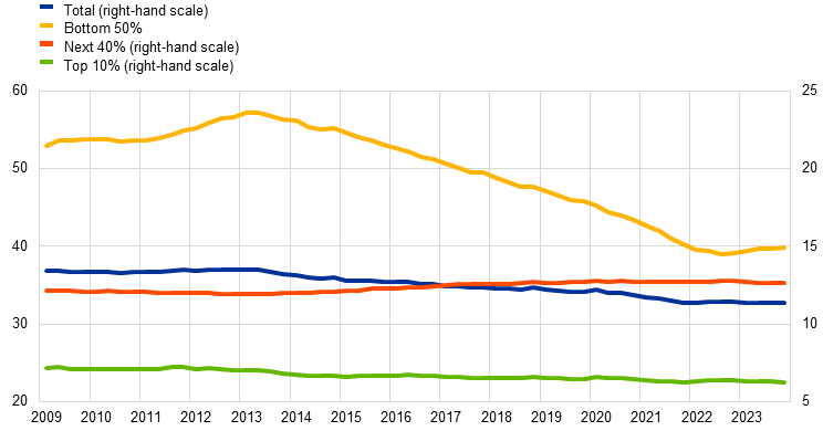 Notes: The chart shows the net wealth holdings by net wealth group as a share of the total. The latest observations are for the fourth quarter of 2023.