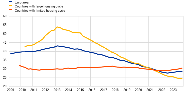 Notes: The leverage ratio is total debt divided by total assets in panel a) and mortgage debt divided by total assets in panel b). In panel b), countries with a large housing cycle are those that experienced a significantly larger decline in house prices (greater than 2% on average per year over 2007-13) compared with the euro area as a whole (-0.35% on average per year over 2007-13), consistent with the assessment in the article entitled “The state of the housing market in the euro area”, Economic Bulletin, Issue 7, ECB, 2018. These countries include Spain, the Netherlands, Ireland, Portugal, Greece, Estonia, Lithuania and Latvia. The countries with a limited housing cycle comprise those with house price changes similar to or greater than the euro area average during the same period; these include Germany, France, Italy, Belgium, Finland, Slovakia, Slovenia and Luxembourg. The country aggregation is performed bottom-up by aggregating assets and liabilities for the bottom 50% of households by net wealth. The starting dates for the DWA differ across countries, consistent with the country-specific HFCS waves. The latest observations are for the fourth quarter of 2023.