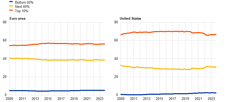 Similar to the Distributional Wealth Accounts (DWA) in the euro area, the US Federal Reserve System compiles the Distributional Financial Accounts (DFAs) for the United States. This dataset contains quarterly estimates of the distribution of US household wealth since 1989.[13] Despite declining visibly over the last few years, wealth inequality remains significantly higher in the United States than in the euro area, with the top decile of the wealth distribution in the United States holding around two-thirds of total net wealth (Chart A).[14]
