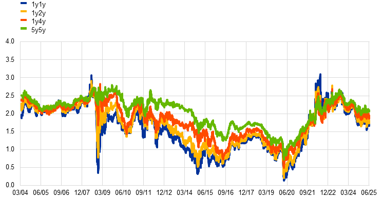 Notes: The 1y4y ILS rate denotes the one-year forward rate starting in four years. The other ILS forward rates are defined accordingly. The latest observations are for 9 July 2025.