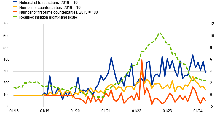 Overall activity in euro area ILS markets has increased considerably since around 2021 (Chart 2). This is evidenced by the notional amount involved in new euro area ILS transactions, which represents the most basic metric of aggregate activity (alongside the number of transactions). The metric did not show much of a structural increase between early 2018 and late 2020. It then picked up markedly alongside the significant rise in realised inflation rates in 2021 and remained consistently elevated up to April 2024. To give a sense of magnitude, at the respective peaks of activity, the (measured) monthly notional traded in euro area ILS contracts exceeded €150 billion, roughly quadrupling from its 2018 average.[7]