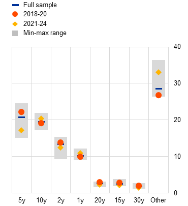The stability in activity across both product types and maturities suggests that euro area ILS trading bears the hallmarks of a mature market. The observation that trading almost exclusively reflects spot transactions also holds true for individual years, as the respective notional shares deviate only marginally from their full-sample averages (not shown). Moreover, the rankings among the most active maturities in the spot category have remained relatively similar over time. This is the case when comparing the 2018-20 and 2021-24 subperiods, as well as when looking at the variation of activity shares across maturities across the individual years in the sample (see the min-max range in Chart 3, panel b). It therefore seems that, within a market that has been in existence for around two decades, participants in euro area ILS transactions flock to established products and maturities to hedge their exposure to, or express their views on, future inflation.