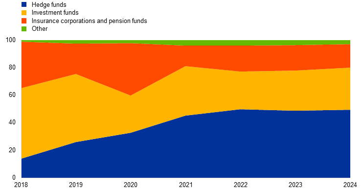 Notes: The chart shows the gross notional traded in the euro area ILS market in a full given year (January to April in the case of 2024) by counterparties stemming from the hedge fund, investment fund, insurance corporation and pension fund, and other sectors. Shares rescaled following the exclusion of notional traded by banks and unidentified counterparties in the sample.