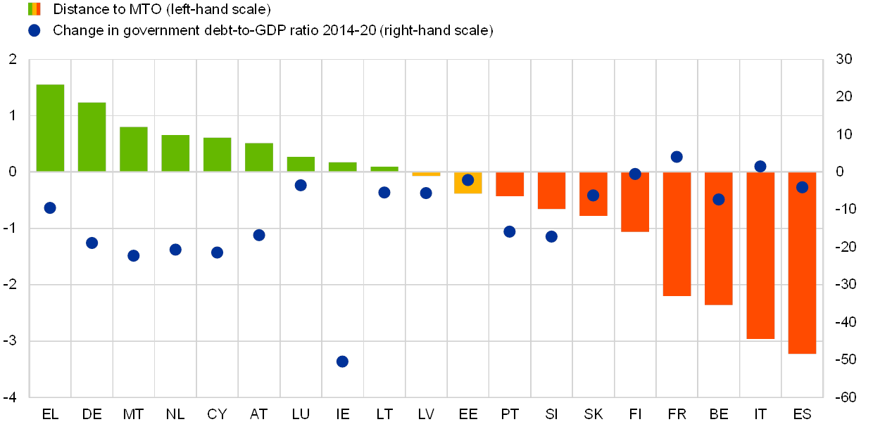 Notes: The chart depicts the deviation of countries’ structural balances in 2020 from their MTOs. Green (orange) bars denote countries whose draft budgetary plan for 2020 is considered by the European Commission to be (broadly) compliant with the SGP. Red bars denote countries whose draft budgetary plan for 2020 is considered by the European Commission to be at risk of non-compliance with the SGP.