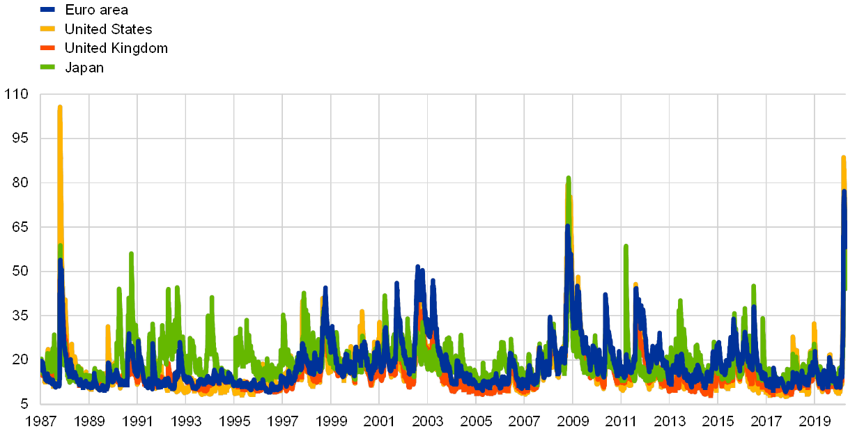 The decline in equity prices has led to a large spike in the variance of their returns. The standard deviation of daily equity returns of major indices in the euro area, the United States, the United Kingdom and Japan is at levels comparable to the peaks associated with the October 1987 stock market crash and the default of Lehman Brothers in September 2008 (see Chart A). Recent turbulence has clearly been global in nature, as shown by the substantial jump in the standard deviation across indices. This is also reflected in a sharp rise, to values close to unity, in the bilateral correlations of equity returns for the four main equity indices, which highlights the presence of a common factor among these returns. The resulting lack of diversification opportunities also amplifies the potential losses faced by international investors.