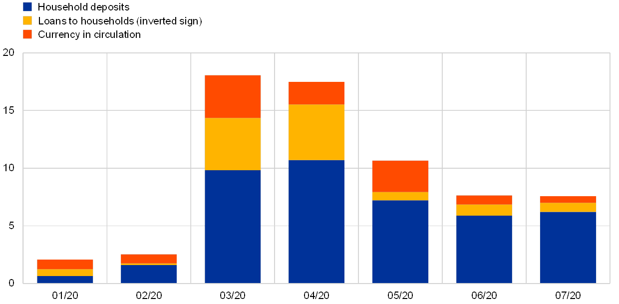 Notes: Loans to households are reported with an inverted sign. The contribution of currency flows is to be considered as an upper bound, as a breakdown by holding sector is not available. The latest observation is for July 2020.