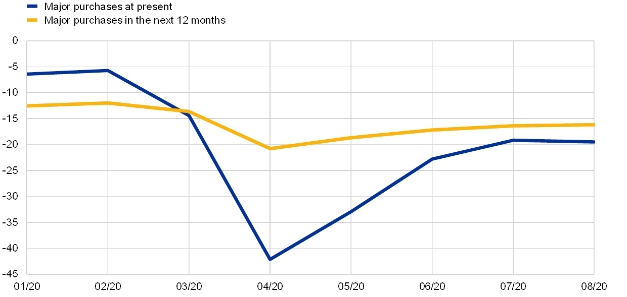 Despite accumulated savings, there is considerable uncertainty regarding pent-up demand in the short term. Pent-up demand describes a rapid increase in the demand for goods, temporarily exceeding pre-downturn levels. As consumers tend to hold off making purchases during a recession, they build up a backlog of demand that is unleashed when signs of economic recovery emerge. The COVID-19 downturn is, however, different given the partly forced nature of the contraction in household spending. Nearly half of the contraction in private consumption reflects expenditure components which could be postponed (e.g. electronics, cars). Recent retail trade data indeed show a strong rebound in a number of product categories which could partly reflect a catching-up effect. However, at this stage it is hard to distinguish this effect from an apparent shift in consumption baskets in response to COVID-19 (e.g. bicycles, home office equipment). The EC consumer survey covering the period up to August (Chart E) suggests that in the next twelve months households expect to spend less on major purchases than at the beginning of 2020, despite the amount of savings they have accumulated. Therefore, over the next year precautionary motives may still keep households’ propensity to save at levels that are higher than before the COVID-19 crisis.