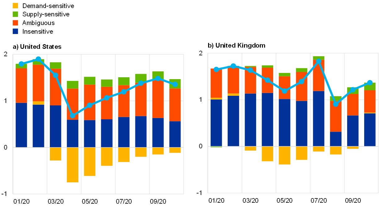 π i , t = β i π 1 t ϵ C O V I D + α i π + ε i , t π   a n d   x i , t = β i x 1 t ϵ C O V I D + α i x + ε i , t π . , where 1 t ϵ C O V I D = 1 t ϵ 2020 M 4 for the United States and   1 t ϵ 2020 Q 2 for the United Kingdom. These equations are estimated for the period from January 2010 to October 2020 in case of the United States and from the first quarter of 2010 to the third quarter of 2020 for the United Kingdom. In the charts we report results for the period from January to October 2020, which is relevant for the pandemic crisis. COVID-19-sensitive components include those categories where either prices or quantities moved in a statistically significant manner at the onset of the pandemic, while COVID-19-insensitive components include all other core inflation categories. Among the sensitive components, demand-sensitive components are those for which prices and quantities changed in the same direction during the initial lockdown period; supply-sensitive components are those for which prices and quantities moved in opposite directions; ambiguous components are defined as sensitive categories with a statistically significant change in either prices or quantity, but not both.