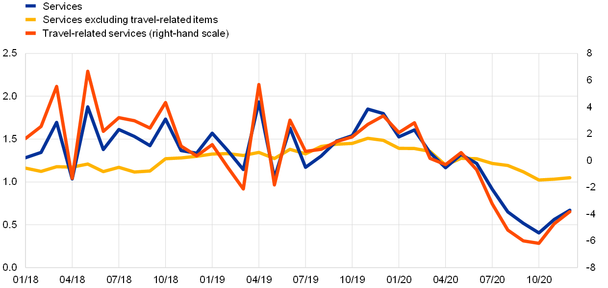 Looking ahead, uncertainty around the outlook for inflation in travel-related services has increased. While lockdown measures have been gradually re-imposed, vaccination campaigns have started across the euro area. If lockdowns become tighter, imputation shares are likely to increase for travel-related items. Firms might hold back on price changes as demand is rather inelastic to price changes in the current circumstances. These factors may hamper the interpretation of actual price pressures. Once lockdown restrictions are lifted again, the normal interplay of price adjustments by firms will be resumed but their size and nature will depend on the prevailing demand and supply conditions. By and large, the outlook for travel-related services inflation remains uncertain as both upside and downside risks may materialise depending on the progression of the COVID-19 pandemic.
