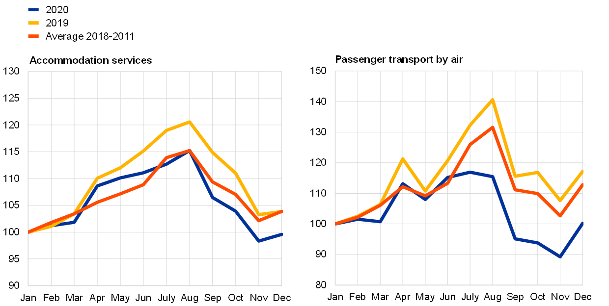 The decline in travel-related services inflation in the euro area is broad-based across its included items (i.e. package holidays, accommodation and passenger transport by air).[4] The drop in inflation rates for passenger transport by air contributed most to the overall decline (about 45%) followed by accommodation services, while package holidays contributed the least to the decline (Chart B, panel a).[5] Usually, travel-related service items show high seasonality, reaching a price-level peak during the summer months. In 2020, the price levels for accommodation services and passenger transport by air (vis-à-vis January) have, since the summer, been below their relative average levels of previous years, and substantially lower than the price levels observed in 2019 (Chart B, panel b). Furthermore, the strong seasonal upward impact on price levels for passenger transport by air, which usually occurs in the summer months, was more muted in summer 2020. Taken together, this implies that the price level for accommodation services and passenger transport by air has been lower since the pandemic started.