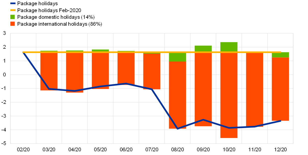 8. The decline in inflation for domestic flights amounted to about 10 percentage points between February and July 2020, whereas it was about 20 percentage points for international flights. Inflation rates of domestic package holidays observed a dip in July and August 2020, but they stayed relatively resilient before and thereafter.