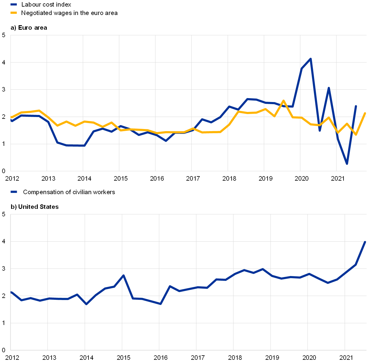 Notes: The latest observation is for October 2021. For the United States, civilian workers comprise workers in the private non-farm economy, except those employed in private households, and workers in the public sector, except the federal government. Wage indicators are being distorted by the effects of the crisis, which complicates their interpretation.