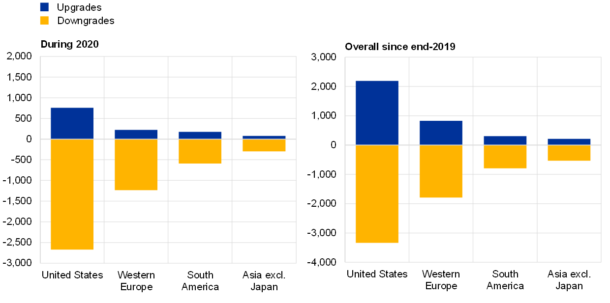 Corporate vulnerabilities increased particularly strongly around the world at the onset of the coronavirus (COVID-19) pandemic and – despite the subsequent recovery – could still be a cause for concern in some parts of the market. Vulnerabilities increased markedly, with firms around the world experiencing a wave of credit rating downgrades (Chart A, panel a). In the course of 2021, corporate credit quality (as assessed by credit rating agencies) recovered somewhat, with US firms, for instance, seeing more upgrades than downgrades. However, credit ratings have not yet fully returned to pre-pandemic levels, as there is uncertainty about longer-term prospects in some sectors – particularly those that have been more affected by the pandemic. Moreover, while earnings per share have increased on average, the ongoing pandemic has had a scarring effect, leaving some firms with weaker earnings, despite public support measures (see, for example, panel b of Chart A, which looks at firms in the S&P 500).