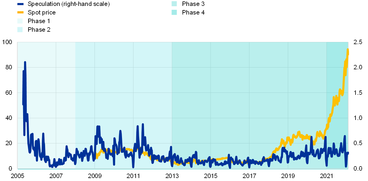 Notes: The EU ETS has undergone numerous changes over the years. Introduced in 2005, the system was designed in trading periods and is now in its fourth trading phase. The latest observation is for February 2022 (ETS spot prices, monthly data).