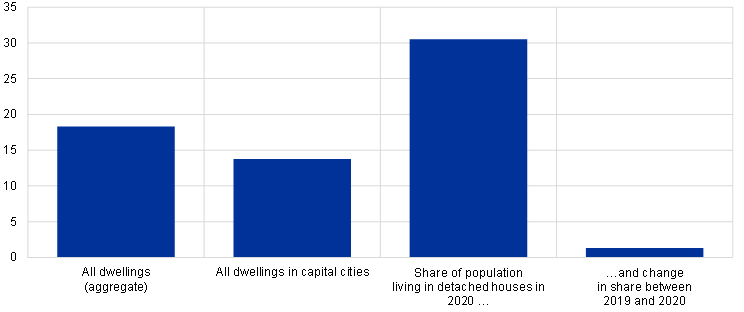 However, housing market developments are affected by other factors – including those of a structural nature – in addition to mortgage rates. While the empirical evidence from local projections points to potentially large downward corrections for the euro area housing market, other factors – not captured by the models – should also be considered. Such factors could increase uncertainty surrounding the housing outlook.[9] Following the COVID-19 pandemic, households now seem to be attaching greater value to more spacious properties that allow people to work from home and are finding locations further from the office more appealing.[10] Preliminary evidence points to higher price rises since the COVID-19 pandemic for detached houses in some of the euro area countries for which data are available (Chart D, panel a). In addition, euro area prices have increased more for properties outside euro area capital cities since the COVID-19 pandemic, and the share of the euro area population living in detached houses increased in 2020 (Chart D, panel b).[11] A preference for more space could also support housing investment. Pandemic-induced shifts in housing preferences could counteract higher mortgage rates and could explain some of the resilience which has been observed in the euro area housing market.