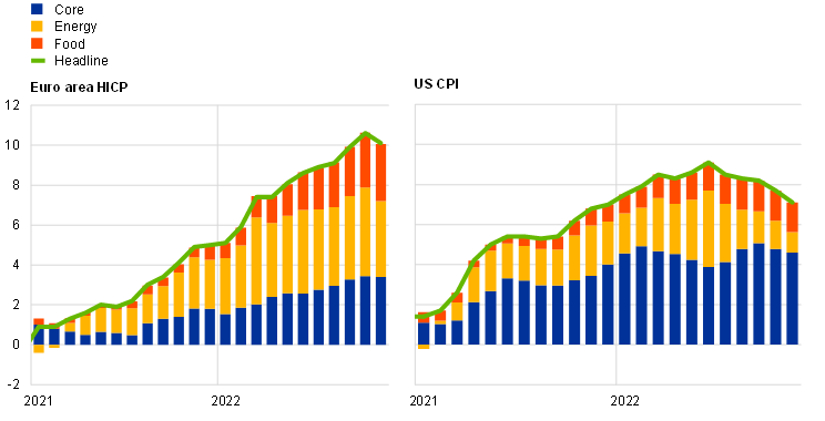 Headline inflation has increased sharply in the euro area and in the United States since the start of 2021. An earlier and stronger increase had been recorded in the United States, but headline inflation has been higher in the euro area since July 2022.[1] In November inflation in the euro area Harmonised Index of Consumer Prices (HICP) stood at 10.1%, after 10.6% in October, while inflation in the US Consumer Price Index (CPI) peaked at 9.1% in June and then moderated somewhat, standing at 7.1% in November.