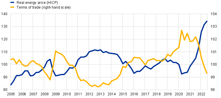 5. The terms of trade can also be affected by other factors (e.g. the nominal exchange rate, the prices of goods and services other than energy). Empirically, however, most of the variation in the euro area terms of trade is explained by energy prices. For a breakdown of the dynamics of household real disposable income into different sources of income and the terms of trade in periods when energy prices fluctuate sharply, see the article entitled “Energy prices and private consumption: what are the channels?”, Economic Bulletin, Issue 3, ECB, 2022.