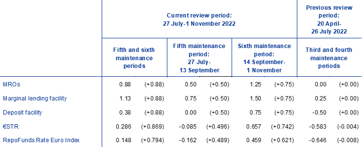 This box describes liquidity conditions and the ECB’s monetary policy operations during the fifth and sixth reserve maintenance periods of 2022. Together, these two maintenance periods ran from 27 July to 1 November 2022 (the “review period”), thus covering the period when the ECB’s policy rate hikes came into effect.