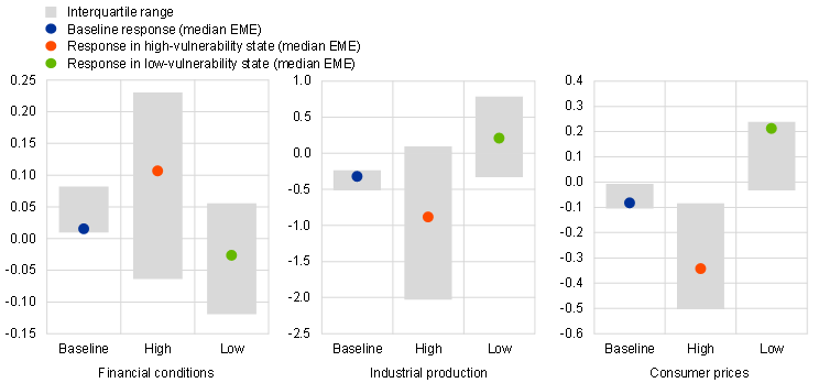 Notes: This chart shows the responses of dependent variables in log terms for economies with differing levels of vulnerability. Using a monthly state-dependent local projections framework (based on Auerbach and Gorodnichenko, op. cit.), we report median estimates for the baseline specification (blue dots), a high-vulnerability state (red dots) and a low-vulnerability state (green dots). The grey bars show the interquartile ranges, indicating the heterogeneity of responses. Responses have been scaled to show the impact of a pure monetary policy shock originating in the United States that results in a 1 standard deviation change in the yield on the underlying financial instrument (five-year US Treasury bonds). In the left-hand panel, higher values indicate tighter financial conditions.
