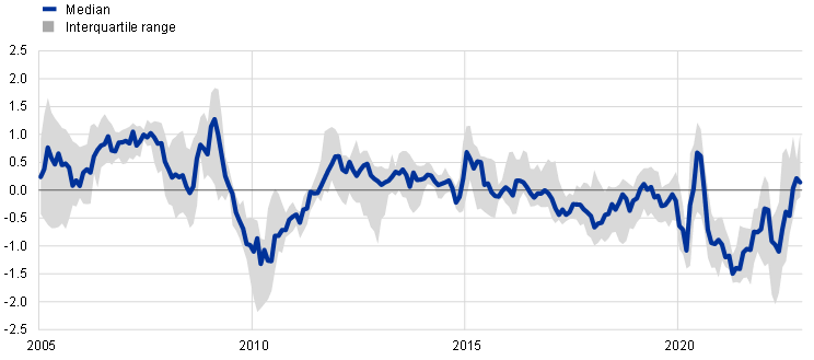 Notes: This index is constructed as the difference between (i) the EME’s actual policy rate and (ii) the policy rate implied by an empirically estimated central bank reaction function (as in Coibion, O. and Gorodnichenko, Y., “Why Are Target Interest Rate Changes So Persistent?”, American Economic Journal: Macroeconomics, Vol. 4, No 4, October 2012, pp. 126-162). The key explanatory variables include expected inflation and output growth one year ahead, and the cyclical position of the economy as captured by contemporaneous estimates of the output gap. In addition, we control for the real effective exchange rate and oil prices. The sample comprises nine EMEs (Brazil, Chile, China, India, Malaysia, Russia, South Africa, South Korea and Thailand) and three EU Member States (the Czech Republic, Hungary and Poland). The sample is smaller than in Chart A, and the time series is shorter, owing to the availability of data required to estimate central bank reaction functions. Positive values mean that monetary policy is tighter than the estimated central bank reaction function would imply, and vice versa. The latest observations are for November 2022.