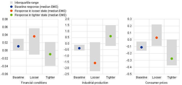 Notes: This chart shows the responses of dependent variables in log terms depending on economies’ monetary policy stances relative to their central bank reaction functions. Using a monthly state-dependent local projections framework (based on Auerbach and Gorodnichenko, op. cit.), we report median estimates for the baseline specification (blue dots), a state where policy rates are below the levels implied by central bank reaction functions (red dots) and a state where policy rates are above the levels implied by central bank reaction functions (green dots). The grey bars show the interquartile ranges, indicating the heterogeneity of responses. Responses have been scaled to show the impact of a pure monetary policy shock originating in the United States that results in a 1 standard deviation change in the yield on the underlying financial instrument (five-year US Treasury bonds). In the left‑hand panel, higher values denote tighter financial conditions.
