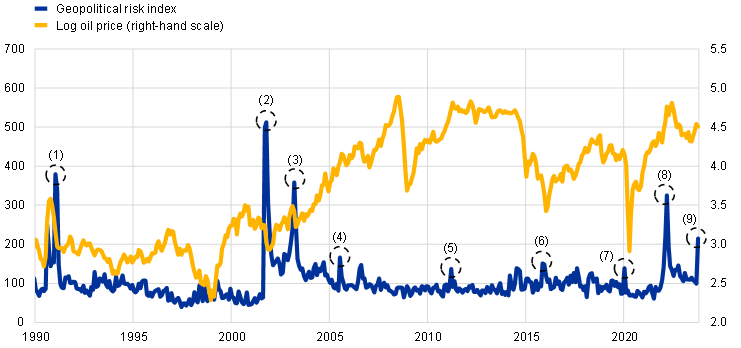The relation between geopolitical developments and oil prices is not clear-cut. Historically, there is no clear relationship between oil prices and geopolitical events, such as emerging tensions between countries or terrorist attacks. For example, immediately after the 9/11 attacks, Brent prices increased by 5% (about five times the average daily change in the Brent price between 2000 and 2023). However, within 14 days the price dropped by around 25% on the back of concerns about weakening oil demand. When Russia invaded Ukraine in February 2022, Brent prices increased by almost 30% within the first two weeks following the invasion. However, prices then decreased again, returning to their pre-invasion levels after around eight weeks. More recently, Brent prices increased by about 4% after the terrorist attacks in Israel on 7 October 2023 before subsequently stabilising.[1] Taking a more comprehensive perspective, Chart A plots the global geopolitical risk (GPR) index of Caldara and Iacoviello (2022) against the log of the Brent crude oil price.[2] The index is constructed by applying text analysis methods to newspaper articles and tracking the news coverage of events related to geopolitical tensions globally.[3] Large spikes in the index, which capture major geopolitical events, are not systematically associated with higher or more volatile oil prices. On the contrary, after many events, oil prices remain weak for several months.