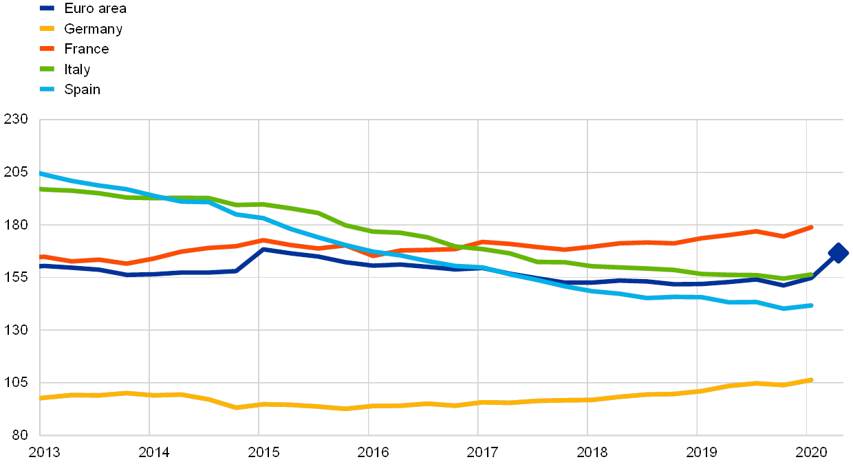 Notes: Debt is defined as the sum of total loans granted to NFCs net of intra-sectoral lending, debt securities issued and pension liabilities. The blue diamond indicates the nowcast for the second quarter of 2020.