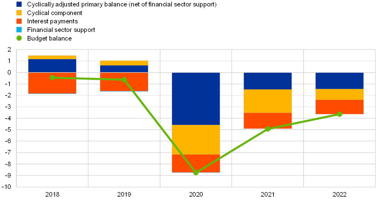 Compared with the June 2020 Eurosystem staff projections, the updated fiscal outlook is marginally more adverse in 2020 and 2021 but slightly more favourable in 2022. The euro area general government budget balance as a share of GDP has been revised down by 0.2 and 0.1 percentage points in 2020 and 2021 respectively, and revised up by 0.2 percentage points in 2022. The higher fiscal deficits in 2020 and 2021 are mainly due to a loosened cyclically adjusted balance as countries introduced additional support measures or extended existing measures. This fiscal loosening is partly offset by a less adverse cyclical component and slightly lower expected interest payments. The slightly improved outlook in 2022 is due to a combination of lower interest payments and a better cyclical component, which more than compensate for the loosened cyclically adjusted primary balance.