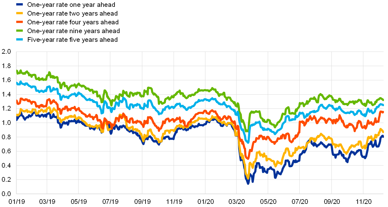 The EONIA forward curve is broadly unchanged compared with the start of the review period (see Chart 4). At the same time, the forward curve displayed discernible intra-period fluctuations. The inversion of the curve in the first part of the review period reflected concerns about the accelerated spread of COVID-19 in Europe, but the curve then flattened on 9 November when the first in a string of positive announcements about vaccines was made. Since then, the curve has remained broadly unchanged. The trough of the curve, which is 10 basis points below the current EONIA level of -47 basis points, corresponds to April 2022. The curve thus indicates that financial markets are not pricing in an imminent rate cut. Furthermore, surveys and model-based evidence suggest that short-term risk-free rates are expected to remain stable over the coming months.