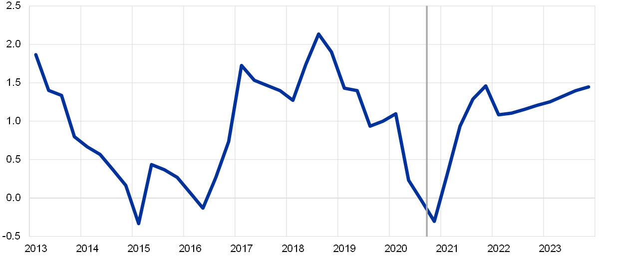 The confluence of the economic consequences of and policy responses to the coronavirus (COVID-19) pandemic poses challenges for interpreting labour market developments – including wage developments. For instance, the substantial changes observed in recent quarters in hours worked per person employed, together with the widespread application of short-time work schemes and issues related to their statistical recording, complicate the interpretation of wage indicators such as “compensation per hour” or “compensation per employee”.[15] The ECB indicator of negotiated wage rates captures the outcome of collective bargaining processes and is not directly affected by these special factors.[16] It also tends to be published around one month earlier than wage indicators based on quarterly national accounts. It should be noted, however, that the pandemic may also have had an impact on the indicator properties of negotiated wages, as it has led to fewer wage agreements being concluded than under normal circumstances. This box considers what role the indicator of negotiated wage rates can play in assessing and forecasting wage developments at the current juncture.