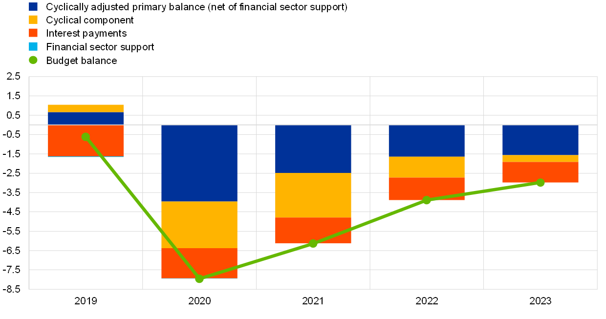 Compared with the September 2020 ECB staff macroeconomic projections, the euro area fiscal outlook is projected to be less negative in 2020 but more negative in both 2021 and 2022. The euro area general government budget balance as a share of GDP has been revised up by 0.8 percentage points for 2020 and down by 1.2 and 0.3 percentage points for 2021 and 2022 respectively. The lower fiscal deficit in 2020 is due mainly to a less negative cyclically adjusted balance but also to a slightly less negative cyclical component. This picture is expected to reverse over the next two years, when both the cyclically adjusted balance and the cyclical component should be more negative than previously expected.