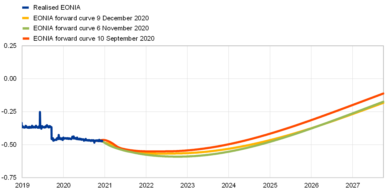 Over the review period (10 September to 9 December 2020) the forward curve of the euro overnight index average (EONIA) fluctuated somewhat, but eventually remained broadly unchanged. This reflects concerns about the accelerated spread of coronavirus (COVID-19) in Europe set against positive vaccine news. As it continues to be inverted only mildly at the short end, the curve does not signal firm expectations of a rate cut in the very near term. Long-term sovereign bond spreads dropped significantly in the euro area amid further expectations of continued monetary and fiscal support together with a global improvement in risk sentiment, triggered in particular by the news of successful vaccine trials. The prices of risk assets increased accordingly. In foreign exchange markets, the euro depreciated slightly in trade-weighted terms.
