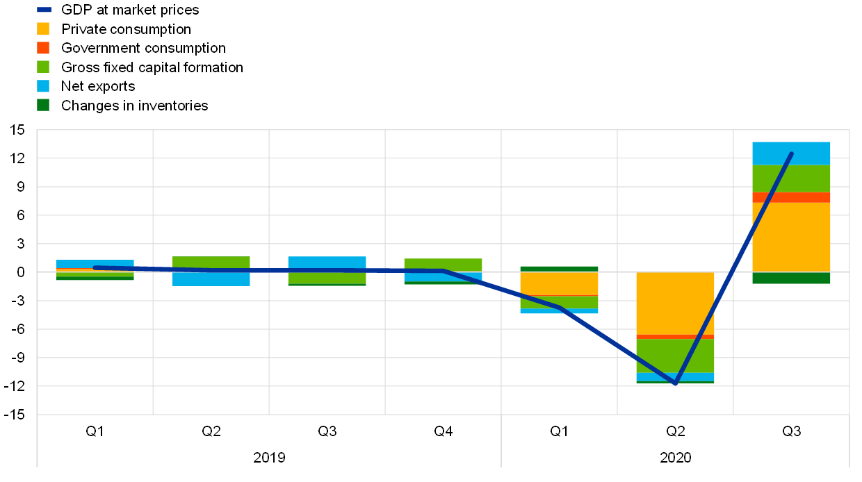 Euro area real GDP grew strongly, by 12.5% quarter on quarter, in the third quarter of 2020. Economic activity in the euro area was underpinned by a sharp rebound in all demand components, as coronavirus (COVID-19) pandemic containment measures began to be lifted as of May 2020. This was reflected in positive contributions to GDP growth from private consumption, investment and net trade. Nonetheless, the level of GDP in the third quarter of 2020 remained 4.4% below its pre-pandemic level in the fourth quarter of 2019. Incoming information about the economy, including from surveys and high-frequency indicators, is consistent with a significant decline in activity in the final quarter of 2020, although to a much lesser extent than observed in the second quarter of this year, as a result of the sharp resurgence of the pandemic and the necessary reintroduction of containment measures since mid-October, primarily affecting the services sector. While real GDP is estimated to have contracted in the fourth quarter of 2020, the outlook for 2021 and beyond remains tightly linked to the evolution of the pandemic and the roll-out of COVID-19 vaccines. The December 2020 Eurosystem staff macroeconomic projections for the euro area foresee annual real GDP decreasing by 7.3% in 2020, and increasing by 3.9% in 2021, 4.2% in 2022 and 2.1% 2023. Compared with the September 2020 projections, real GDP growth has been revised upwards by 0.7 percentage points for 2020, downwards by 1.1 percentage points for 2021 and upwards by 1.0 percentage points for 2022, thereby broadly recovering to the level projected in the September baseline scenario over the medium term. Although downside risks to the outlook have become less pronounced owing to the news about the prospects for vaccine roll-outs in the near future, they remain tilted to the downside on account of the implications of the pandemic for economic and financial conditions.