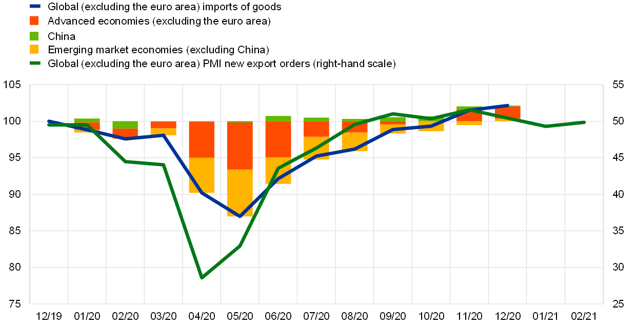 The global economy rebounded from the recession induced by the pandemic faster than expected. Global investment – benefiting from favourable financing conditions amid strong monetary policy support – is already close to pre-pandemic levels. However, the recovery in global consumption, supported by fiscal measures to bolster income and preserve jobs, continues to lag, as prevailing containment measures weigh on contact-intensive services. Global (excluding the euro area) real GDP growth rebounded strongly, by 7.4%, in the third quarter of 2020, which was 0.7 percentage points more than expected in the December 2020 Eurosystem staff macroeconomic projections. A more dynamic pace of recovery was observed in both advanced and emerging market economies. Following this V-shaped rebound, the recovery in global economic activity is expected to continue into the fourth quarter of 2020 at a robust but more moderate pace of 2.1%, which is still stronger than in the previous projections.