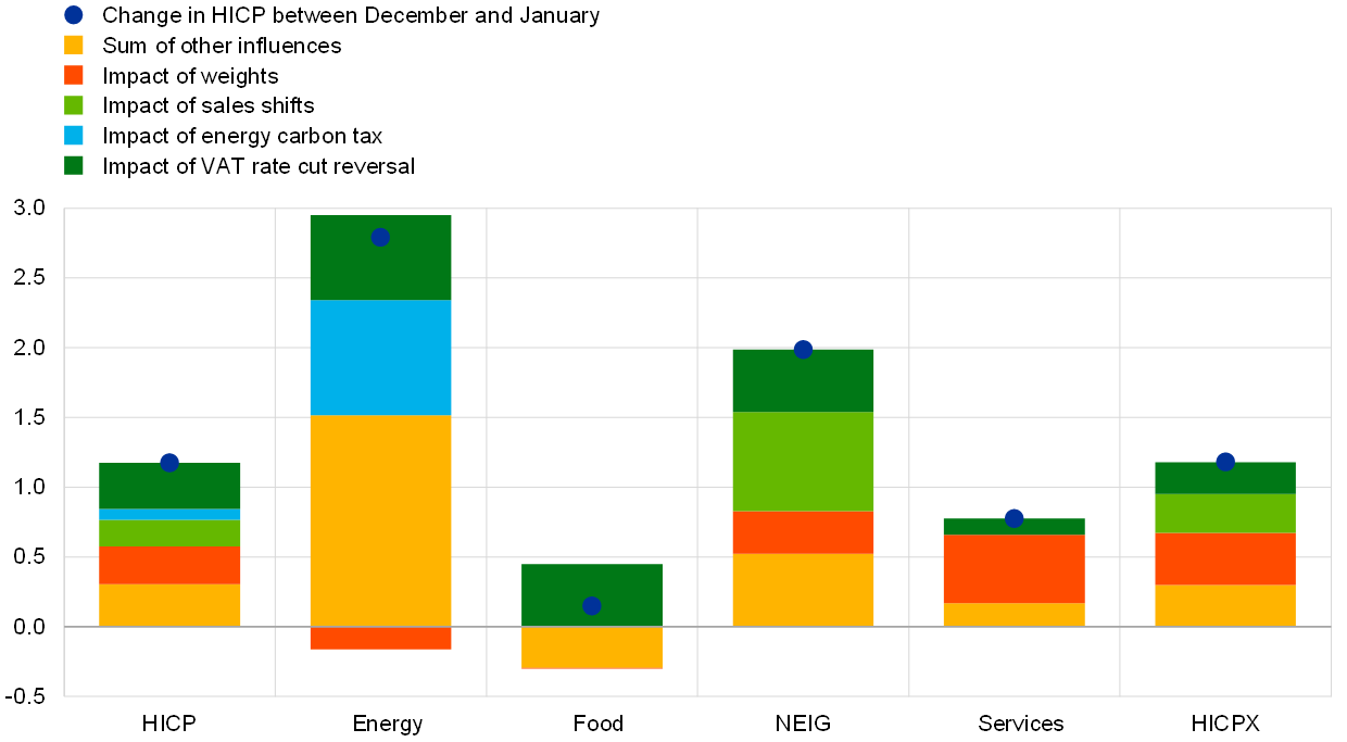 6. However, this impact will change across the year and was estimated at 0.1 percentage points in February. For more information, see the box entitled “HICP weights in 2021 and their implications for inflation” in this issue of the Economic Bulletin. The impact of the weight change can only be reliably estimated with the full release.